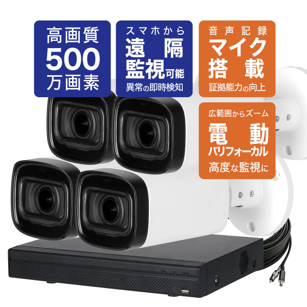 HD-CVIとは同軸ケーブルを使用して高画質の監視映像を伝送するための規格です。このセットはHD-CVI方式500万画素(一般的なフルハイビジョン(約200万画素)の2倍以上の精細さ)の防犯カメラ(C5B-02)4台とモバイル監視機能付レコーダー、設置工事を含むセット商品です。標準工事には防犯カメラ本体の設置、配線工事、モニター出力確認、録画確認が含まれます。特殊工事が必要な場合、また現場地域によっては別途費用が発生する場合がございますので、まずは無料見積りをご依頼ください。