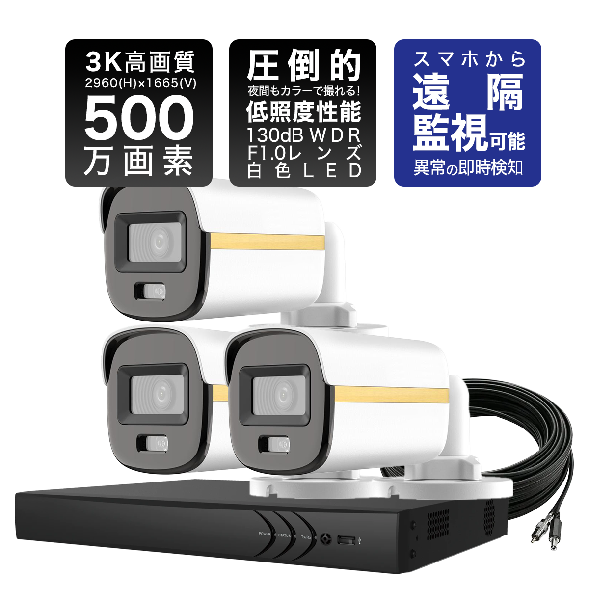 最高画質/証拠能力優先 ―500万画素T6B-01防犯カメラ3台+2TBレコーダー+標準工事セット